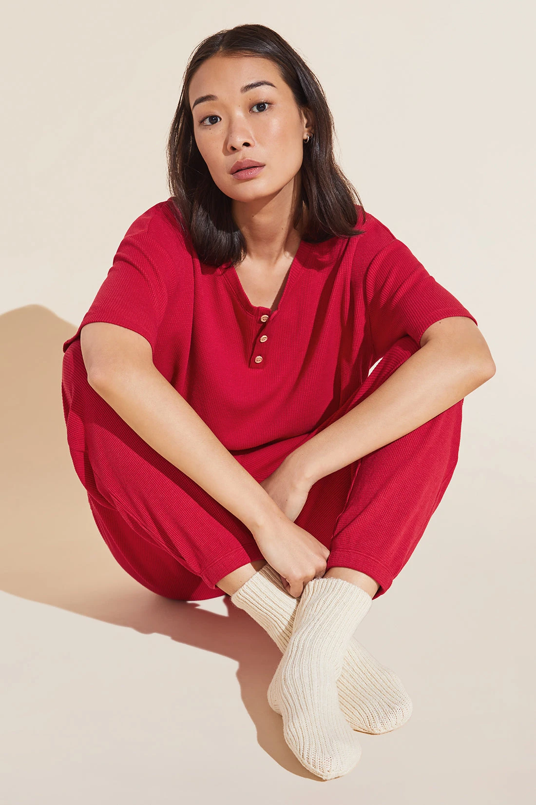 PJ’s for the one who loves sleep. Cut from plant-based TENCEL™ Modal fibers and cotton, our Cozy Waffle fabric is gently textured and feels as soft as it looks. The Henley short sleeve top and sleep joggers with a wide elastic waistband will give you your best night’s sleep yet. So long, night sweats.
