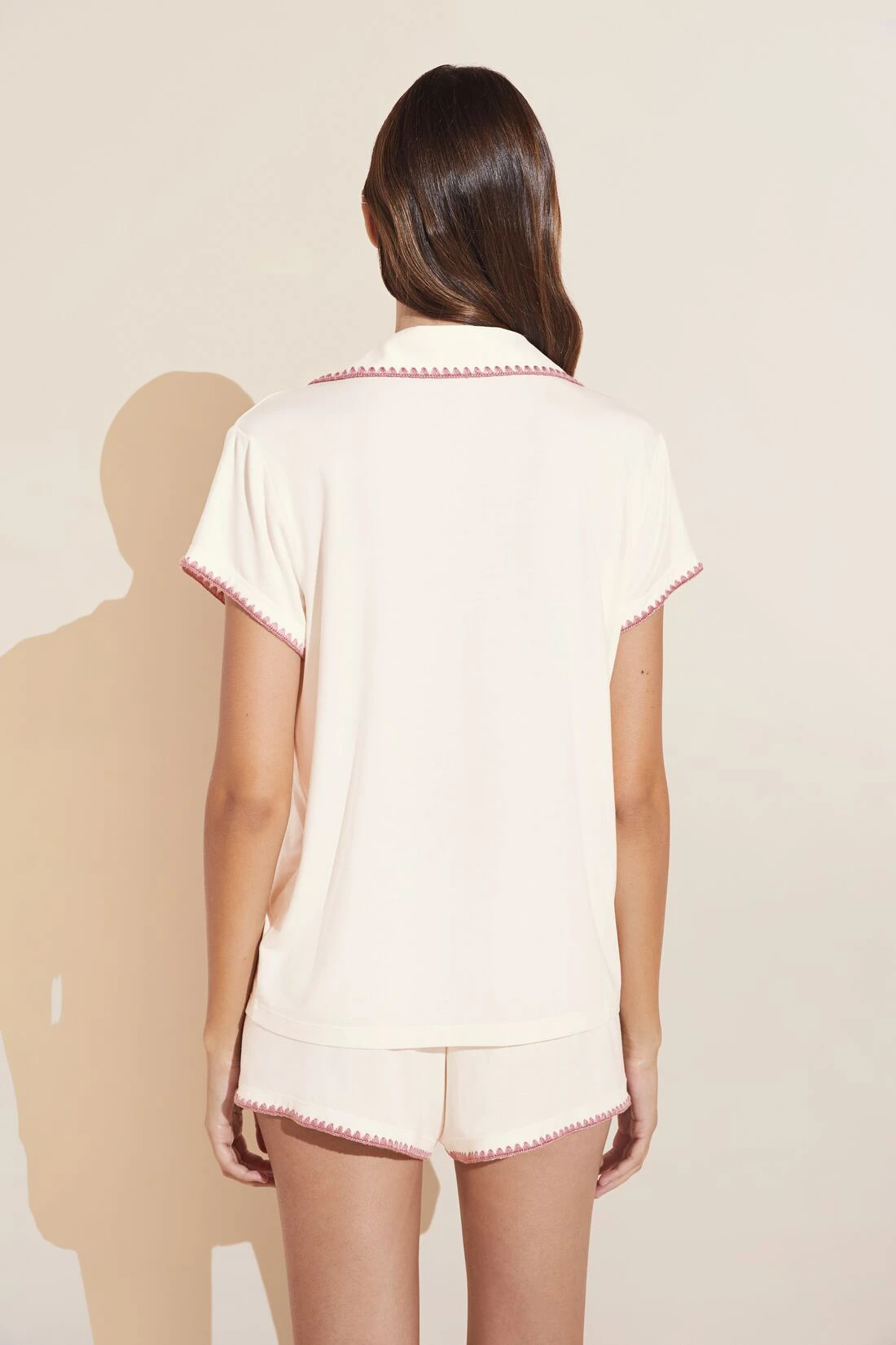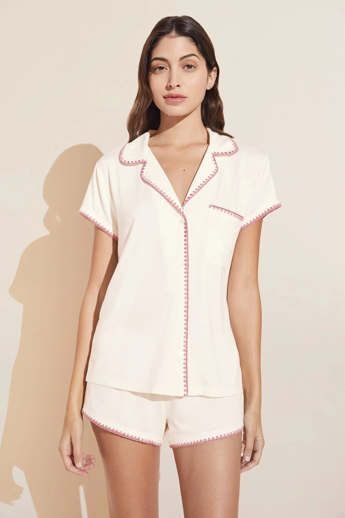 We took all the best features of our best-selling Gisele collection—the softness, the comfort, the temperature-regulating fabric—and added eye-catching artisanal whipstitch piping to both the top and bottom for a playful, Bohemian vibe. Made from TENCEL™ Modal fibers and a touch of spandex, this super soft fabric is verified by OEKO-TEX® Standard 100, meaning it’s dyed with safe and non-toxic dyes. This set has a classic slim fit short sleeve top and a low-rise cheeky short with an elastic waistband, so you can feel comfortable and stylish all at the same time. Pair Pima intimates underneath for breezy ZZZ’s.
