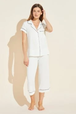 In the mid-2000s, we set out to create the world’s softest pajamas for a beautiful night’s rest. Gisele delivers, merging a classic men’s PJ silhouette with sustainable TENCEL™ Modal fibers. Our luxurious, temperature-regulating knit fabric drapes and falls in all the right ways, enveloping the body in comfort. Plus, it’s machine washable, and gentle on skin, so it not only feels beautiful but it’s easy to care for, too. Reach for the cropped set when you want a sharp, polished look or if you prefer an ankle-length pant.