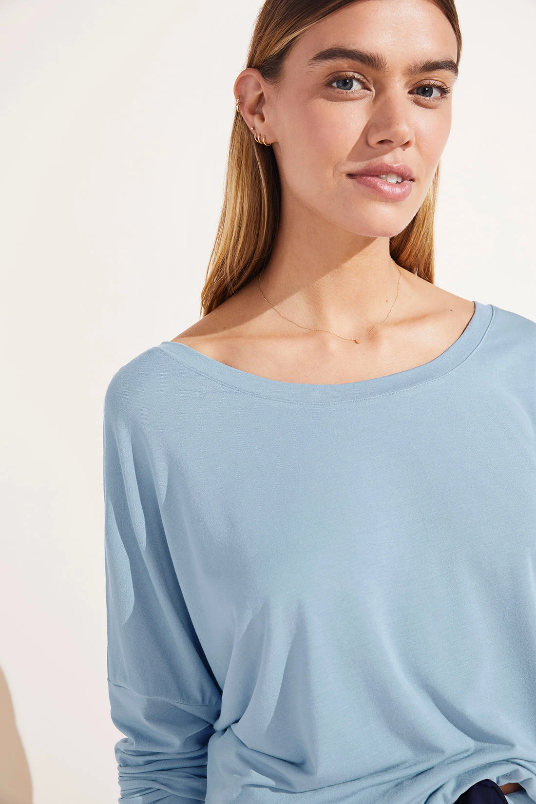 • Long sleeve top with scooped boat neckline, slim sleeve, and roomy drop shoulder