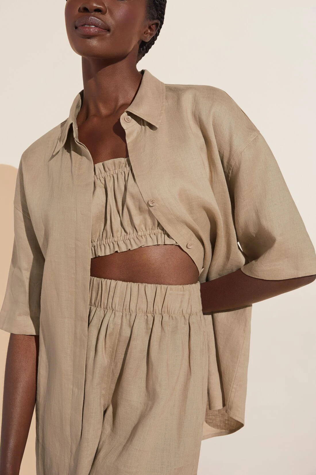Easy breezy. Made from 100% linen, this plant-based three piece set is breathable and lightweight. Plus, itās verified by OEKO-TEXĀ® Standard 100, meaning our fabric is processed without harmful chemicals and dyes in a mill that uses safe and non-toxic dyes. This breathable set features a high-rise short with an elastic waistband, a pull-on ruffle bandeau with adjustable straps, and an oversized button down with elbow-length sleeves. Perfect for sleep or heading to the beach, wear as a set or style separately.