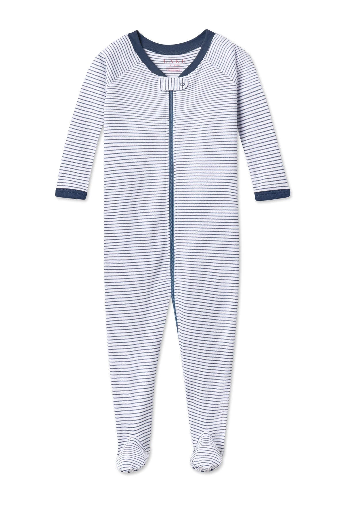 Classic Navyย features a dual zipper for easy diaper changes. Designed for sleep or play in silky soft, naturally hypoallergenic 100% Pima cotton, this fuss-free, footed style includes sole grips on sizes 3-6m & up.
