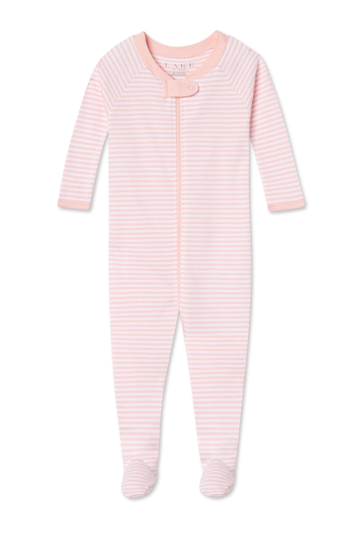The Baby Sleeper in English Rose Stripe, a subtly warm pink stripe set on white, features a dual zipper for easy diaper changes. Designed for sleep or play in silky soft, naturally hypoallergenic 100% Pima cotton, this fuss-free, footed style includes sole grips in sizes 12-18m & 18-24m.