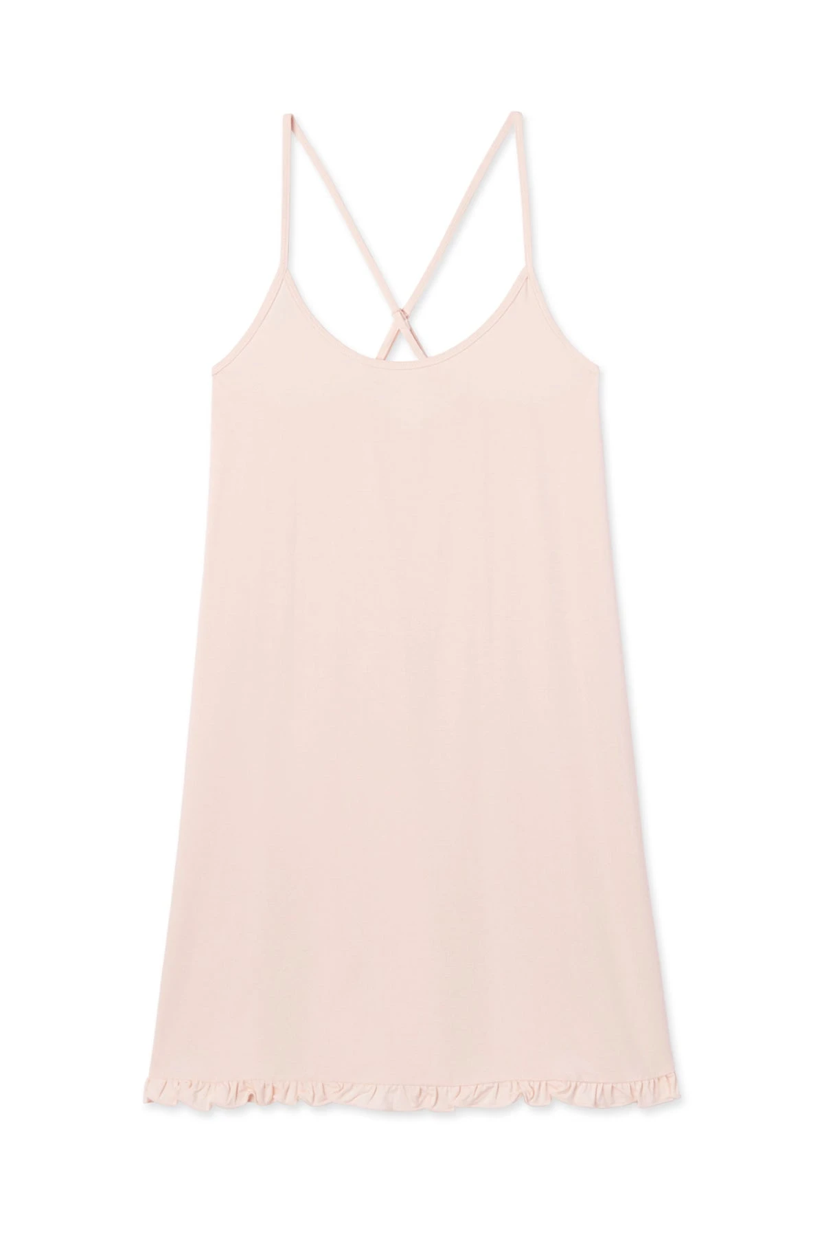 The DreamKnit Charlotte Ruffle Nightgown in Peony, a blushing whisper of Pink, features crossed, adjustable spaghetti-straps with a ruffled hemline. Made of 95% modal, 5% spandex.