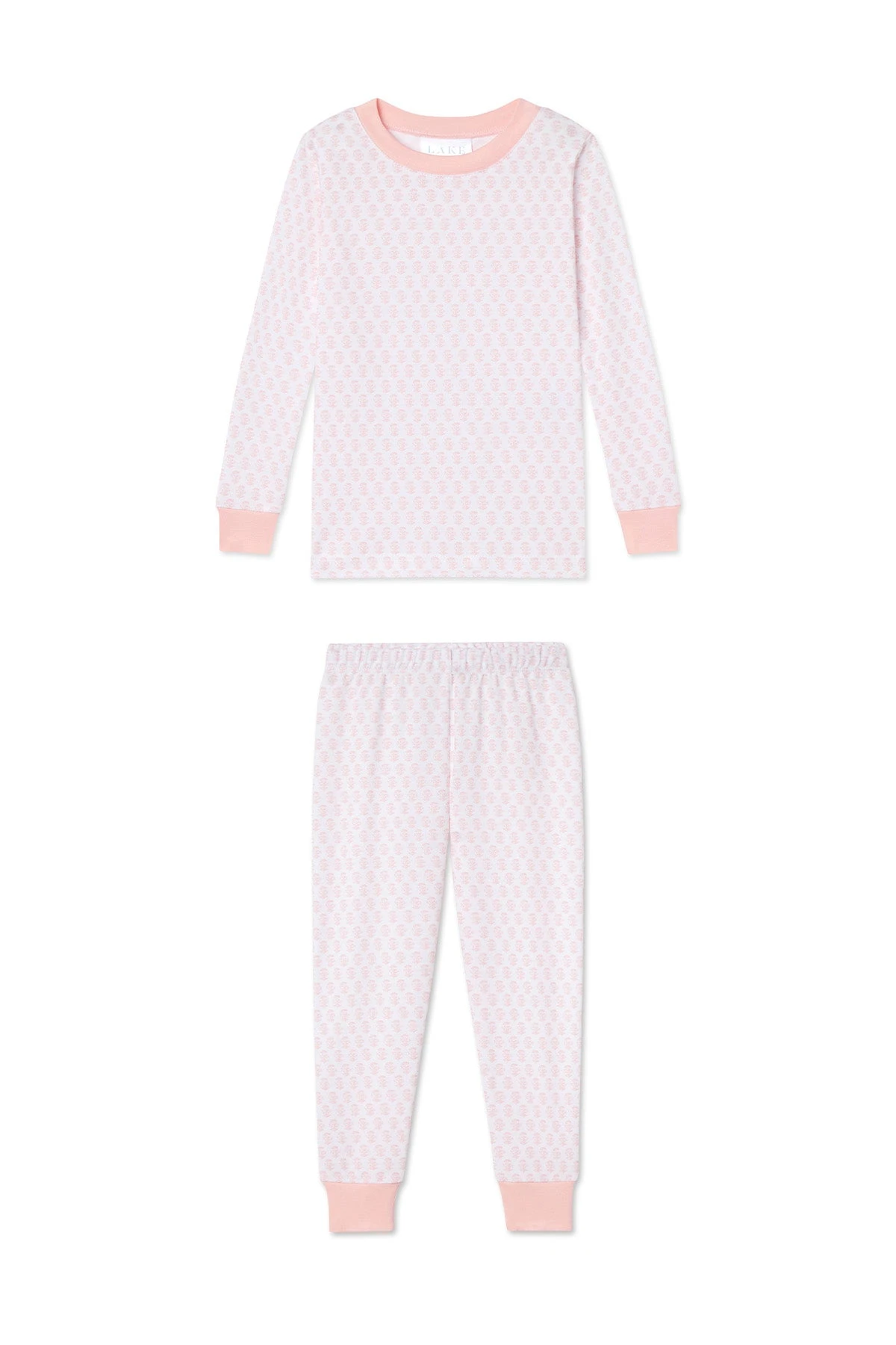 The Kids Long-Long Set in English Rose Blockprint, a hand-painted mini block print, features a long-sleeve top and pants with an elastic waistband. Made from 100% Pima cotton. This garment is not flame resistant. For the child’s safety, this garment should fit snugly.