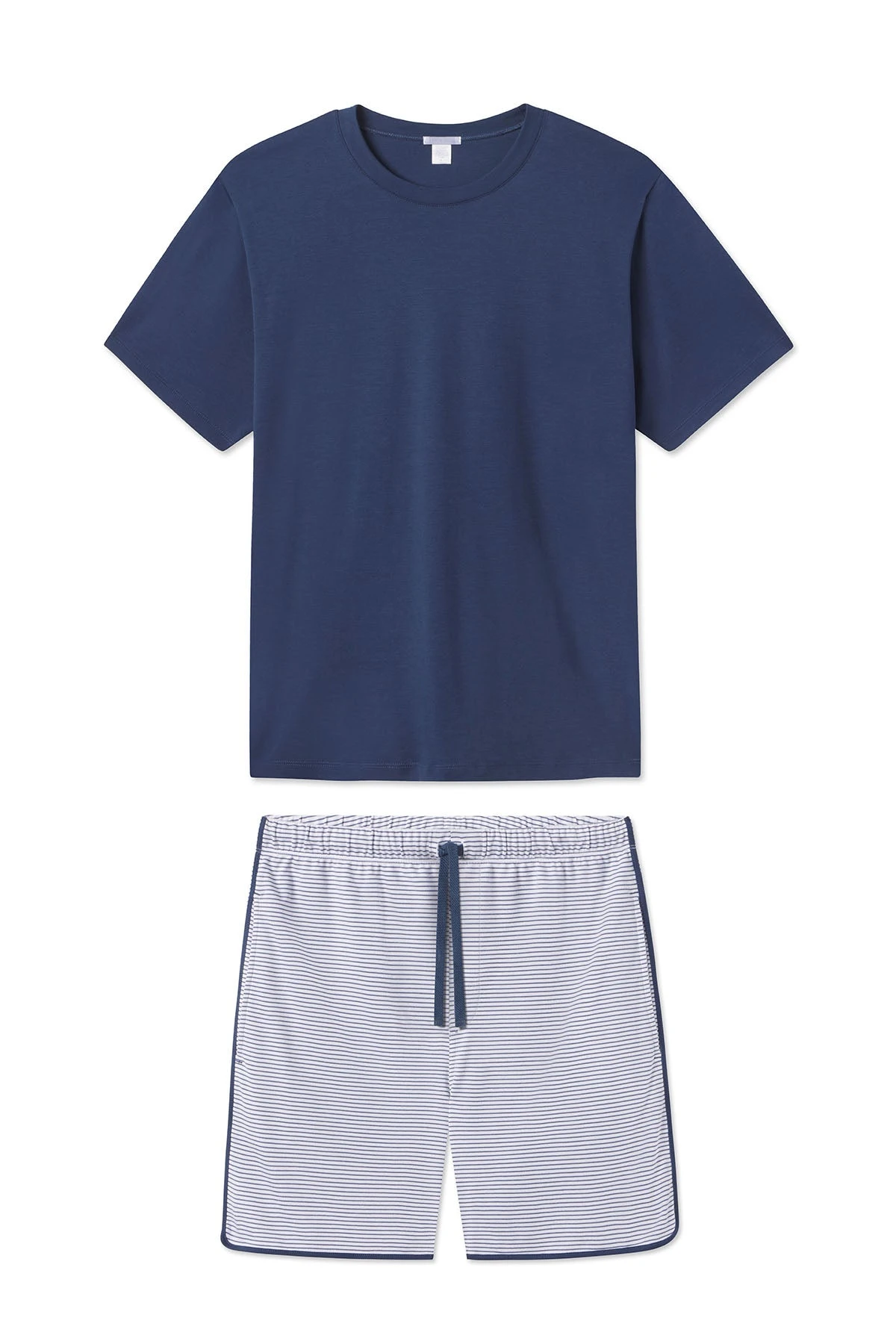 The Men’s Pima Pajama Shorts Set in Classic Navy features shorts with a navy and white micro stripe, an elastic waistband, curved hem, navy contrast piping, a faux fly, drawstring tie, and pockets. Paired with a solid blue short-sleeve Pima tee, this set will strengthen his lounge game in the softest cotton imaginable. Made from 100% Pima cotton.