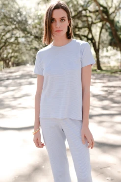 The Men’s Pima Pajama Shorts Set in Pacific features aย tonal blue-on-blue micro stripe,ย an elastic waistband, a curved hem, navy contrast piping, a faux fly, a drawstring tie, and pockets. Paired with a solid blue short-sleeve Pima tee, this set will strengthen his lounge game in the softest cotton imaginable. Made from 100% Pima cotton.