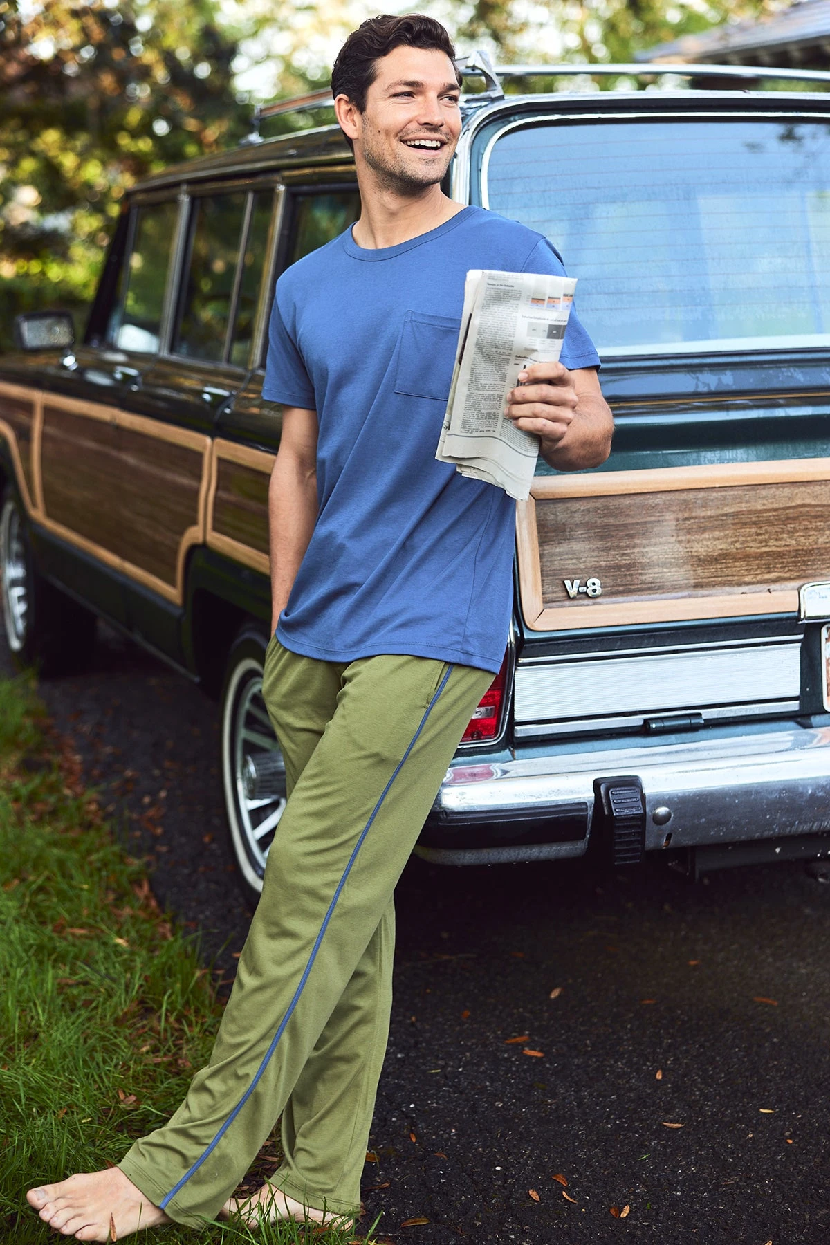 The Men’s Slumber Short-Long Set in Olive pairs our Slumber pants — featuring a functional tie, faux fly, and affixed, on-seam pockets with contrasting, deep blue binding — with a super-soft crewneck pocket tee in deep blue. Made from 100% Pima cotton.