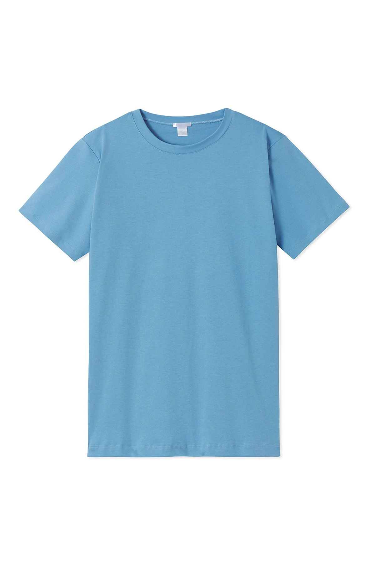 The Mens Short Sleeve Pima Tee in Pacific, a blue inspired by surf and sky, is ideal for lounging at home or cruising in comfort. This style is a short-sleeve crewneck and is made from luxuriously soft, 100% Pima cotton.