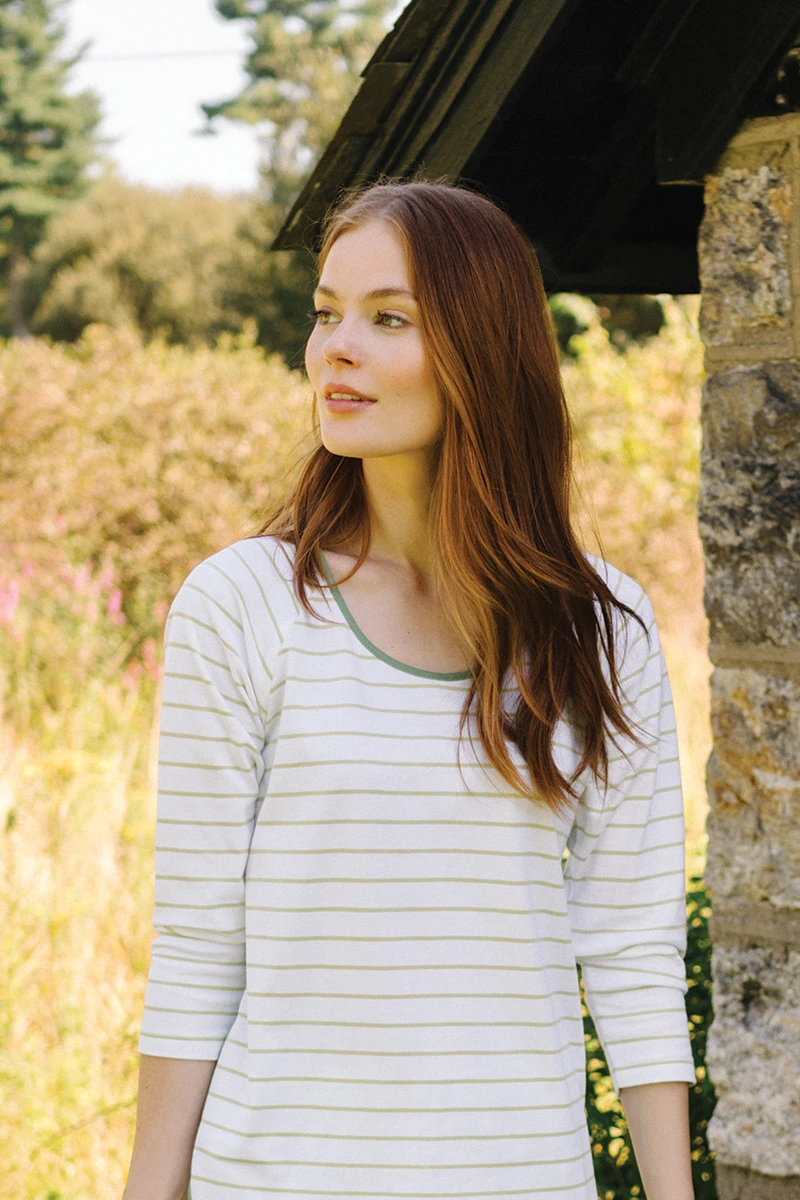 The Pima Long Sleeve Nightgown in Vine, a grass-green micro stripe, features a scoop neck, three-quarter length sleeves, and is designed to hit at the knee. Made of 100% Pima Cotton.