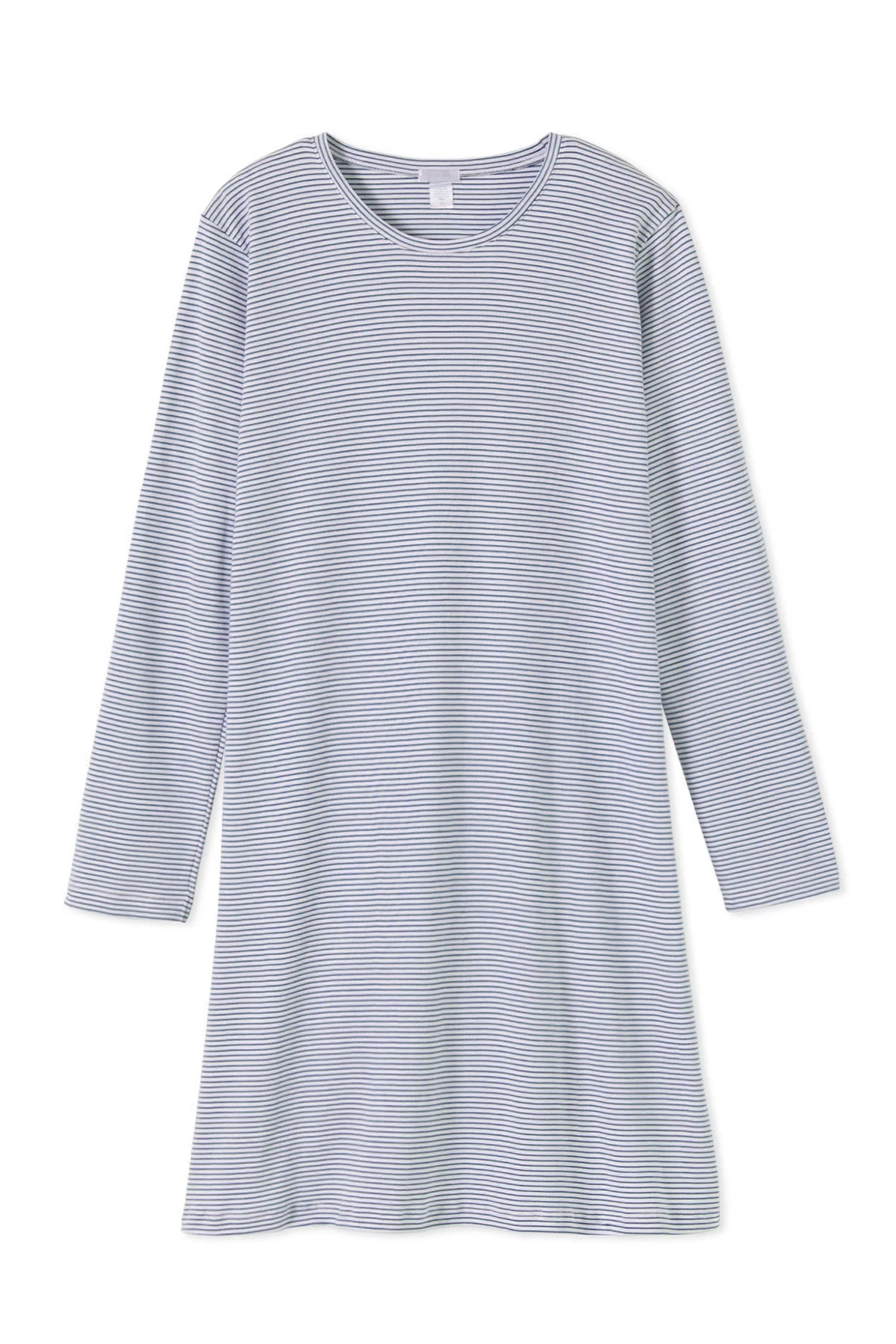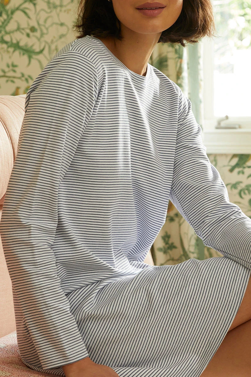 The Pima Long Sleeve Weekend Nightgown in Classic Navy, a traditional blue and white stripe, features a long-sleeve crewneck with an A-line silhouette. Made from 100% Pima cotton.