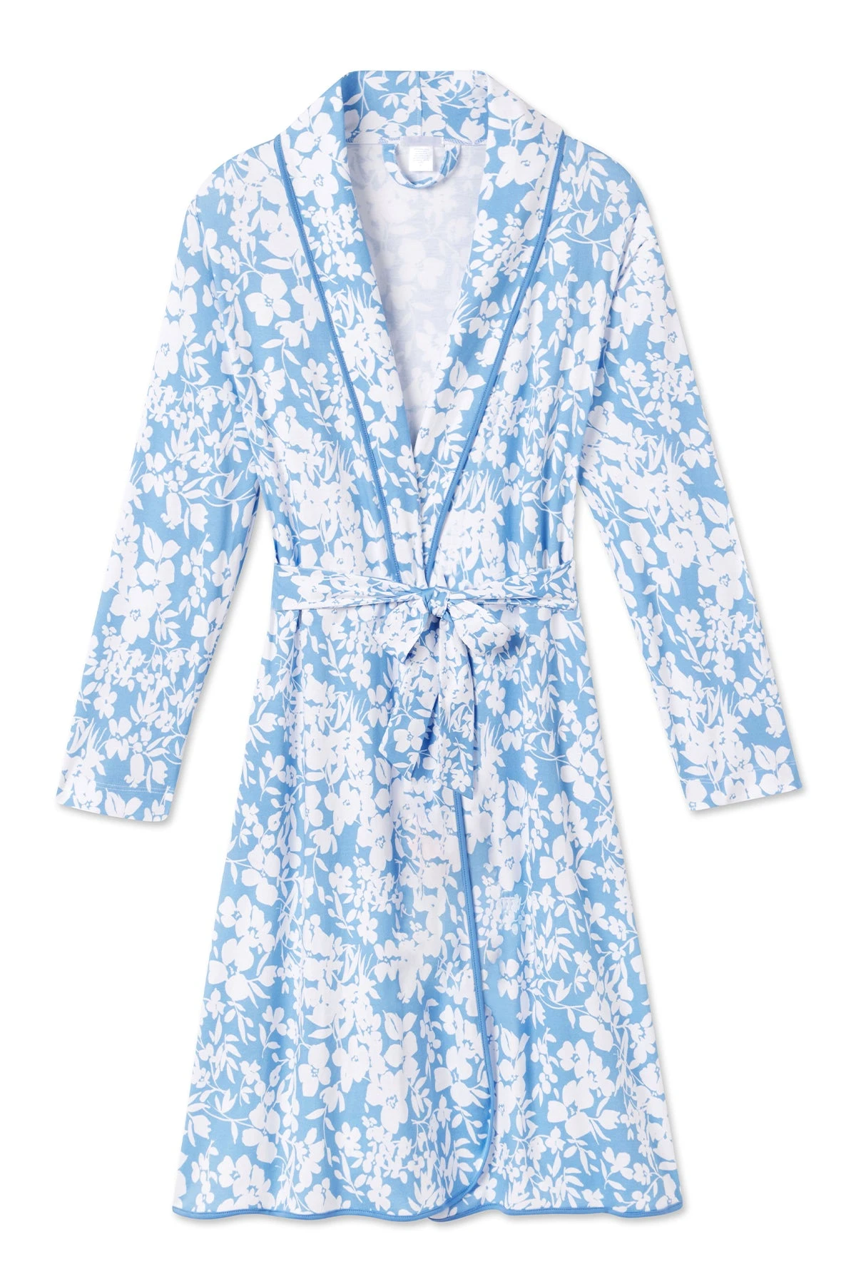 The Pima Robe in Sky Floral, a white floral print set on sky blue, features long sleeves, a sewn-in belt, and side pockets. Made from 100% Pima cotton.