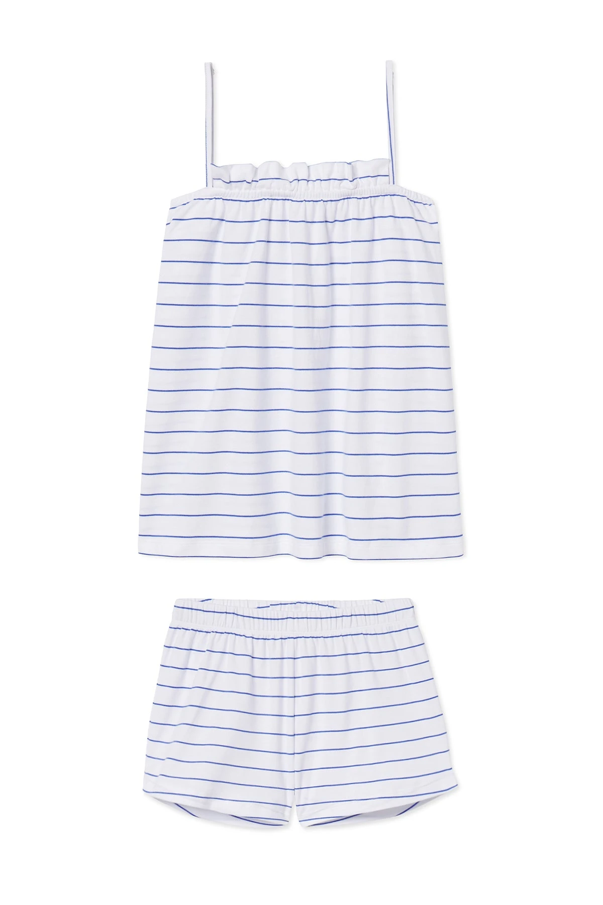 The Ruffle Shorts Set in Cobalt, a royal blue for the discerning blue and white devotee, features a feminine ruffle detail across the front and adjustable spaghetti straps with a fully elasticated top. Made from 100% Pima cotton.
