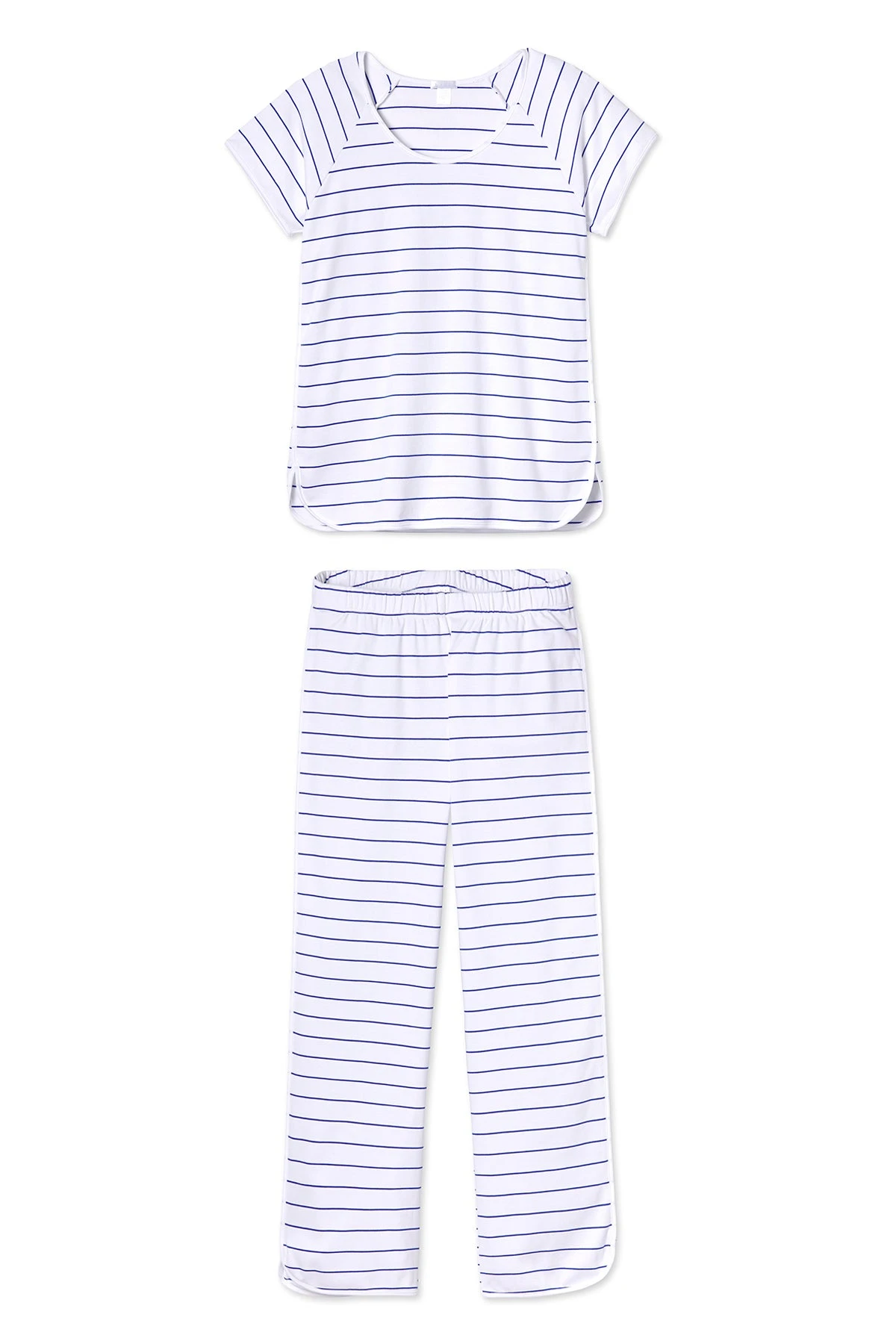 The Pima Short-Long Set in Cobalt, a royal blue for the discerning blue and white devotee, features a short-sleeve scoop neck top and pants with an elastic waistband. Made from 100% Pima cotton.