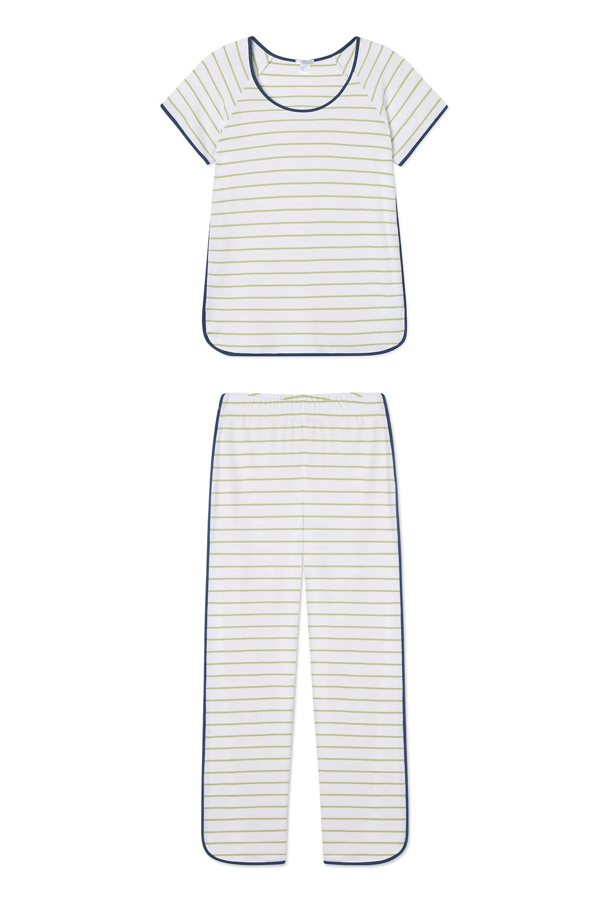 The Pima Short-Long Set in Olive Stripe, a thin, green stripe with contrasting blue binding, features a short-sleeve scoop neck top and pants with an elastic waistband. Made from 100% Pima cotton.