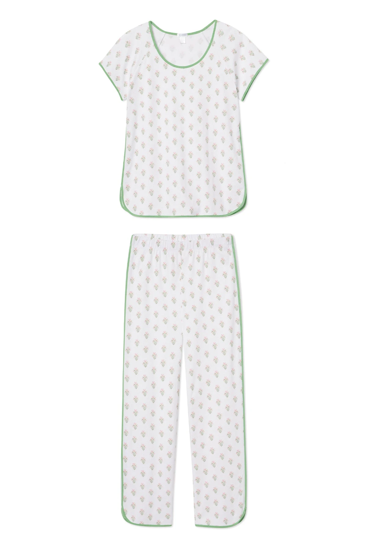The Pima Short-Long Set in Pink Flora, a block print pattern of pink buds and flowers with grass green trim, features a short-sleeve scoop neck top and pants with an elastic waistband. Made from 100% Pima cotton.