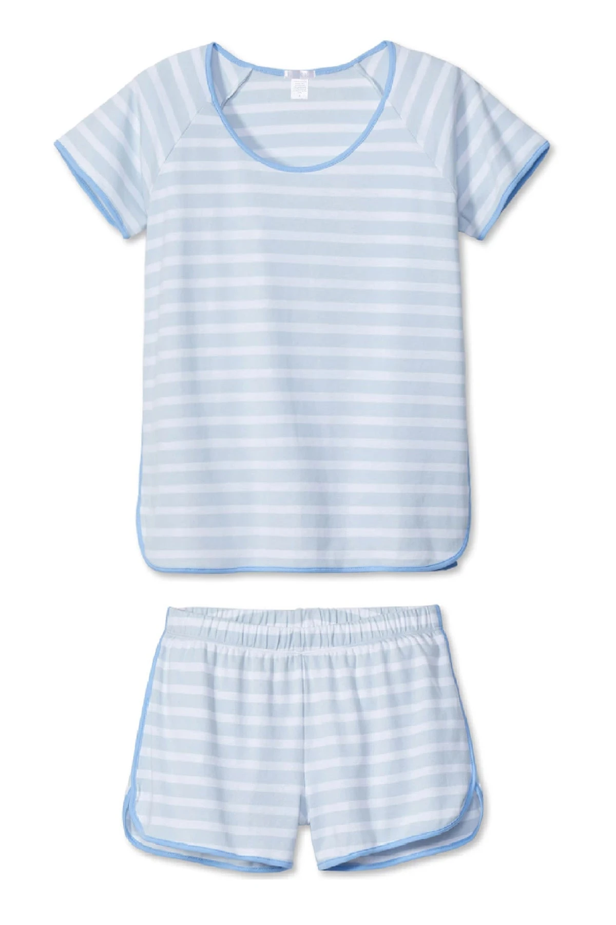 The Pima Shorts Set in Seaside, a muted blue and white stripe with contrasting blue trim, features a short-sleeve scoop neck top and shorts with an elastic waistband. Made from 100% Pima cotton.